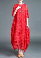 Questo abito lungo rosso con motivo a rose in trasparenza unisce romanticismo, volume e leggerezza.