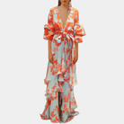 Questo abito lungo con stampa floreale e maniche a balza è perfetto per un look sofisticato e romantico.