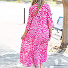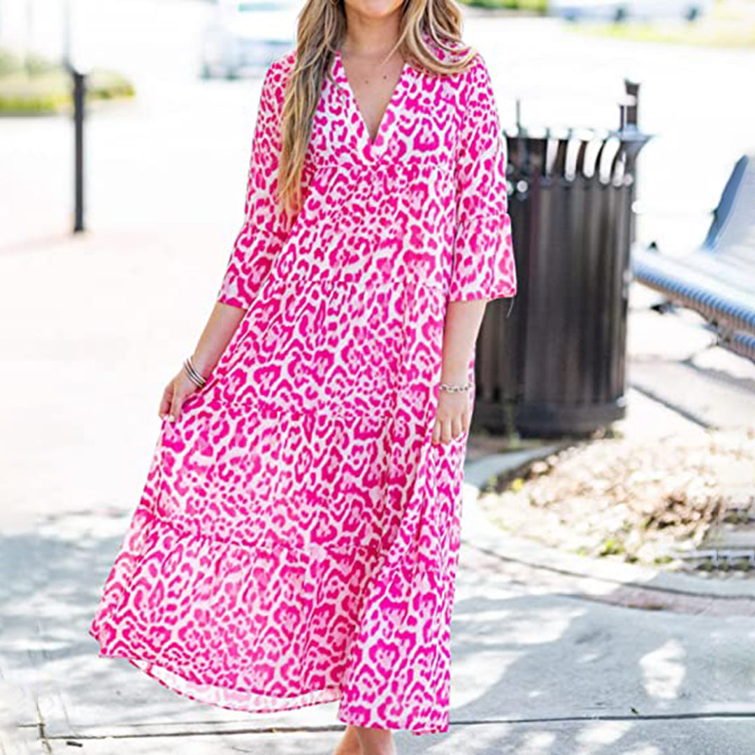 Questo abito lungo floreale rosa è la scelta ideale per un look fresco e femminile. Con il suo taglio ampio, la stampa vivace e le maniche a 3/4, è perfetto per passeggiate estive, brunch con le amiche o vacanze al mare.