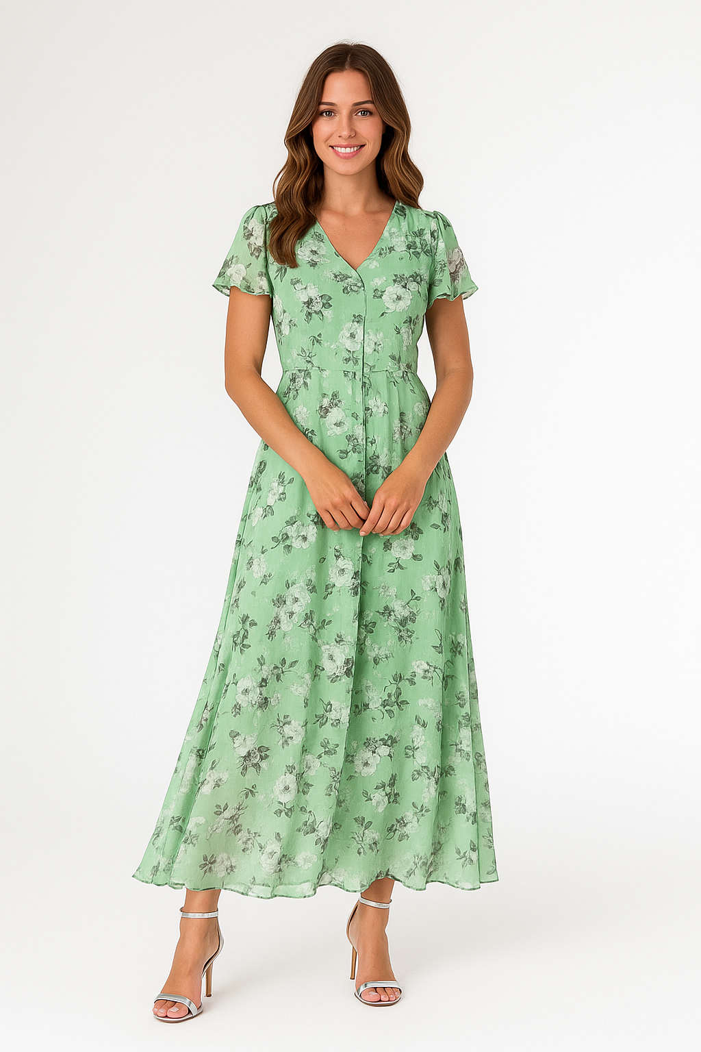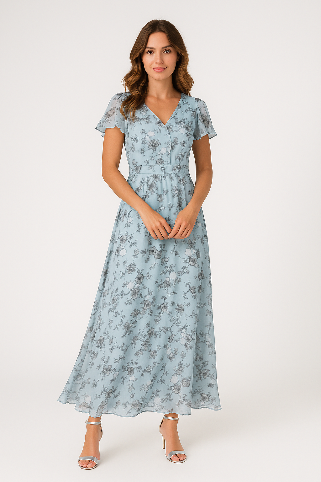 Questo maxi abito floreale con maniche a farfalla e scollo a V combina grazia, leggerezza e un tocco romantico.