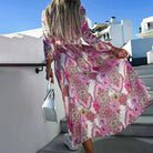 Questo abito lungo floreale con scollo a V profondo e spacco laterale è perfetto per un look glamour e sofisticato sotto il sole.