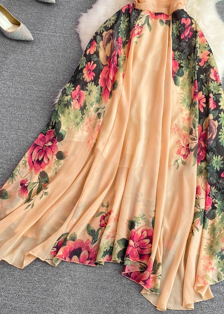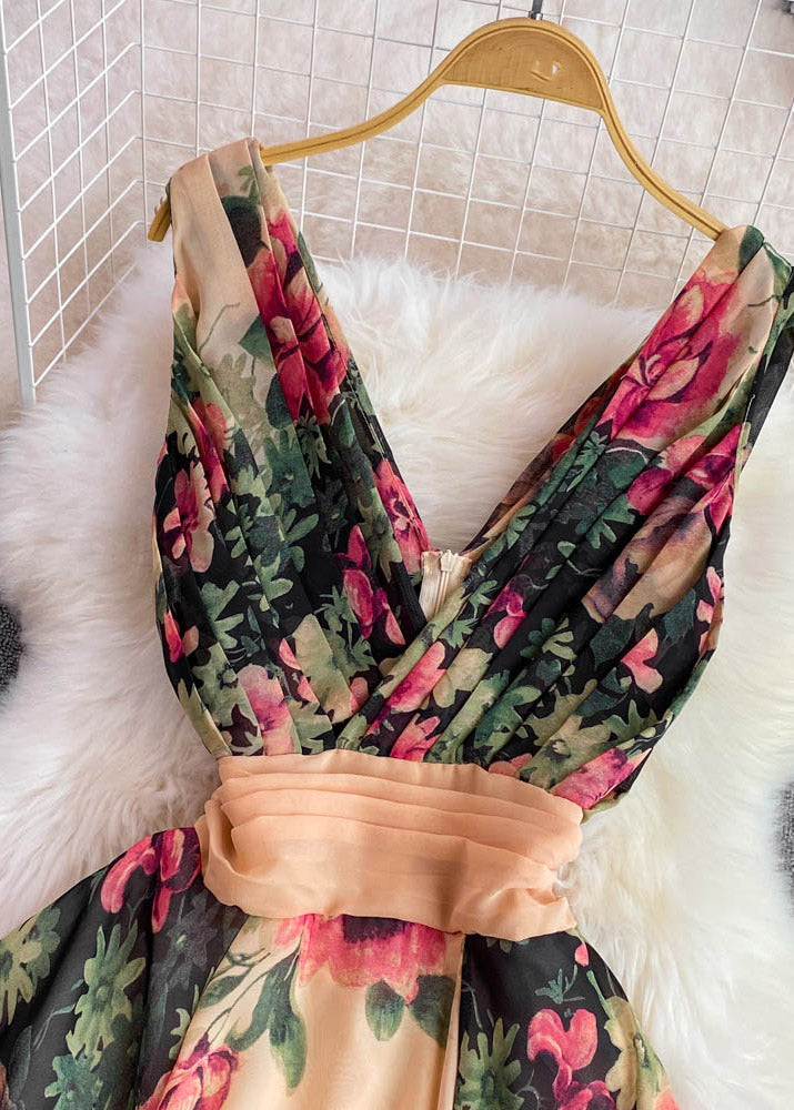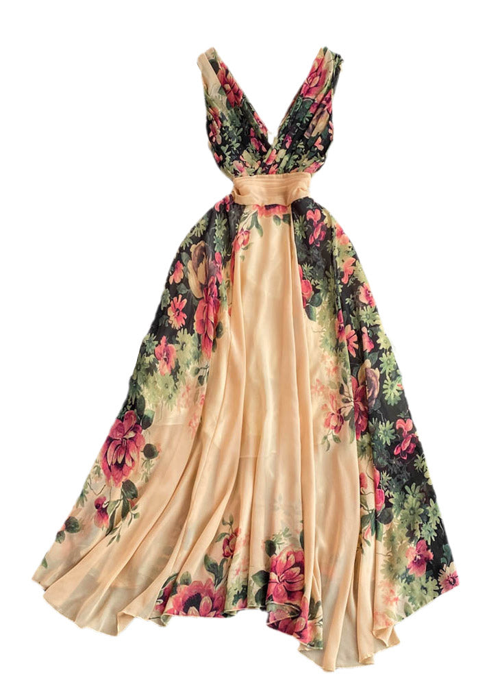 Questo vestito lungo con scollo a V incrociato e stampa floreale su sfondo sfumato unisce sensualità ed eleganza in un design senza tempo.