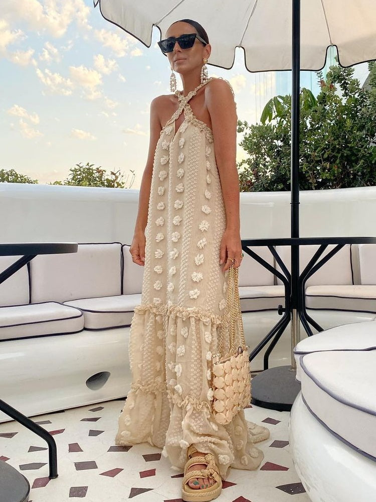 Questo abito lungo color champagne è un capolavoro boho realizzato in pizzo crochet traforato con dettagli floreali. Il design con scollo allacciato al collo e schiena scoperta esalta la femminilità con charme rilassato, mentre la silhouette svasata e fluida dona movimento e leggerezza. Perfetto per un tramonto sulla spiaggia, un aperitivo vista mare o un festival chic in stile bohemien.