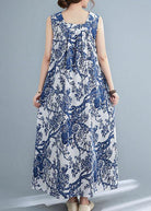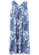 Questo maxi dress senza maniche con stampa floreale blu su base bianca è perfetto per chi ama l’eleganza rilassata.