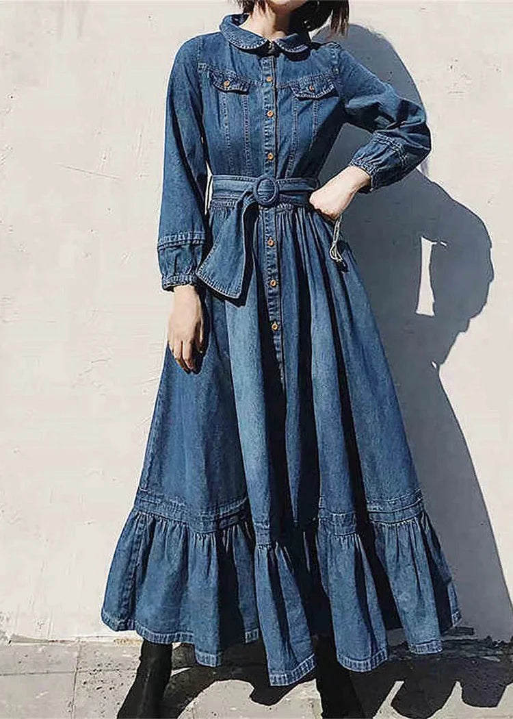 Questo abito lungo in denim unisce la praticità del jeans al fascino vintage del taglio svasato con volant.