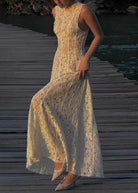 Questo abito lungo in pizzo bianco senza maniche emana romanticismo e classe senza tempo.