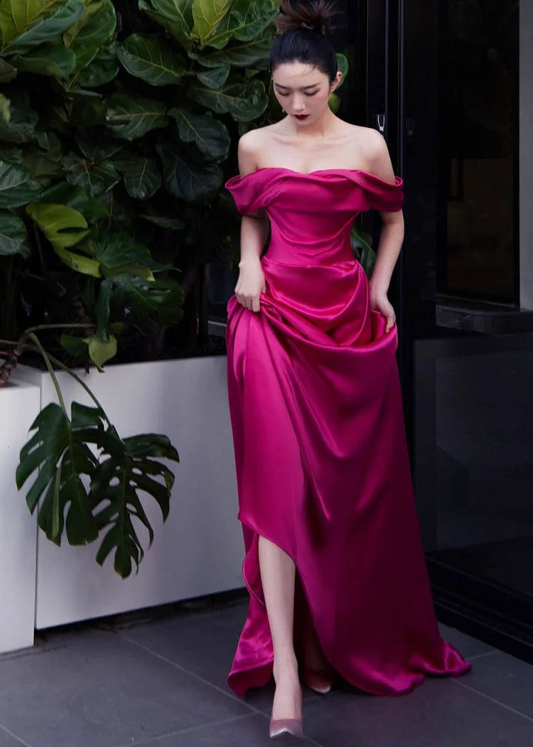 Questo abito lungo in satin con scollo a spalle scoperte è pensato per chi desidera un look raffinato e femminile.