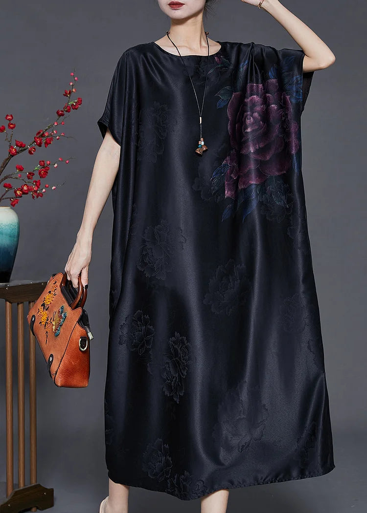 Questo abito lungo in satin nero con stampa floreale tono su tono combina raffinatezza e comfort in un taglio ampio e fluido.