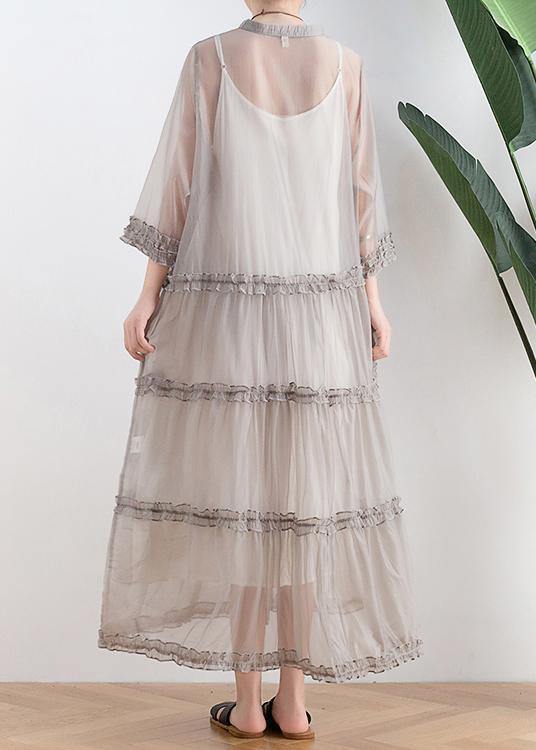 Questo abito lungo con strato superiore in tulle trasparente è romantico e raffinato, con giochi di trasparenze e dettagli arricciati che lo rendono unico.