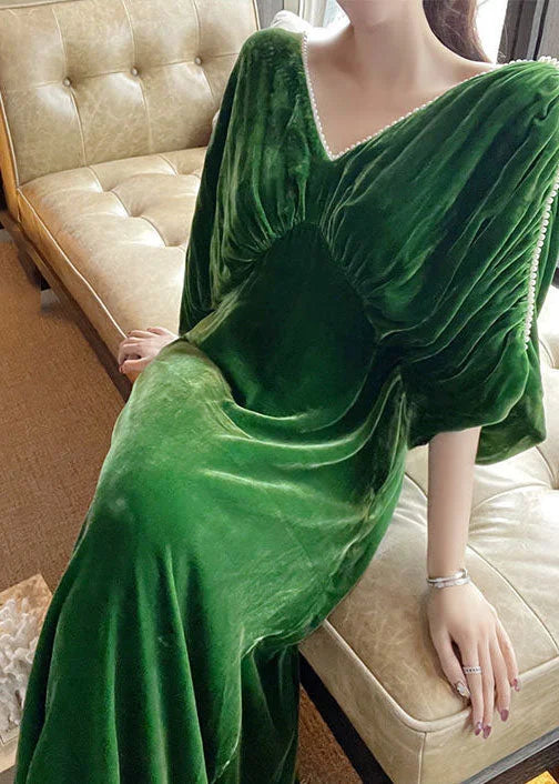 Questo abito lungo in velluto verde dona un'eleganza lussuosa con il suo drappeggio morbido e la scollatura rifinita con perle.
