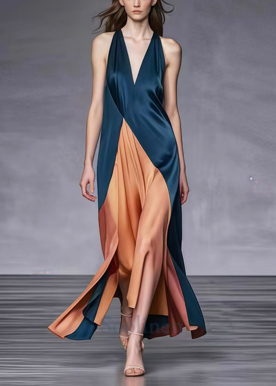 Questo vestito lungo in raso con scollo profondo e taglio incrociato combina sensualità e raffinatezza in un mix di colori sofisticati.