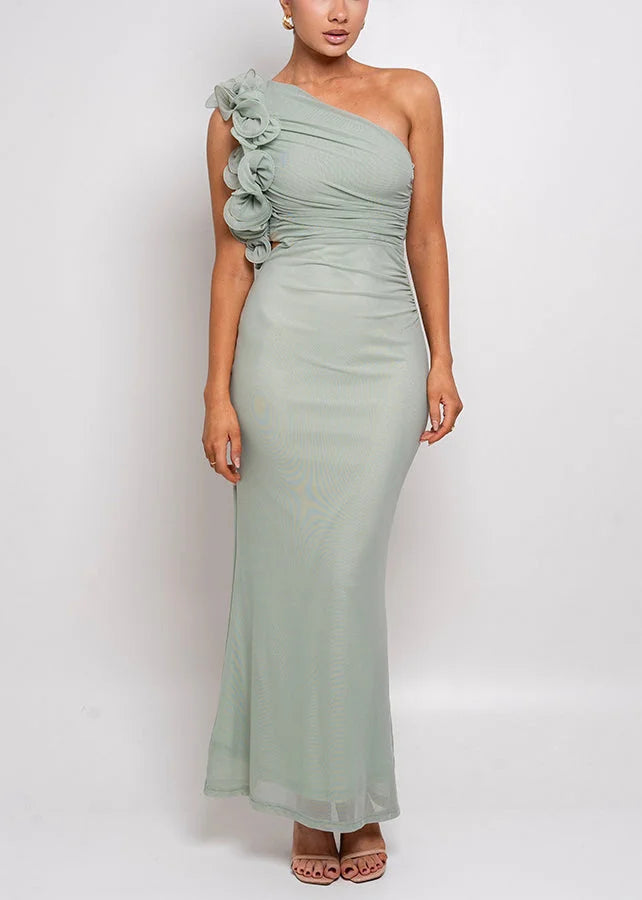 Questo vestito lungo monospalla con applicazioni floreali è pensato per valorizzare la tua figura con eleganza e raffinatezza.
