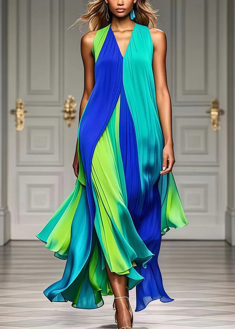 Questo abito lungo multicolor unisce tonalità di blu e verde in un design fluido e sofisticato.