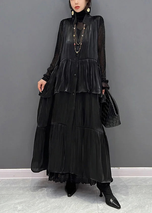 Questo abito nero a strati con tessuto plissettato regala un look sofisticato e femminile, perfetto per eventi formali e occasioni importanti.