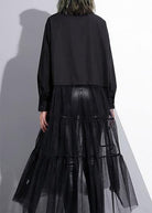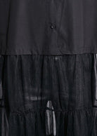 Questo abito lungo total black con parte superiore stile camicia e gonna in tulle è audace e sofisticato.