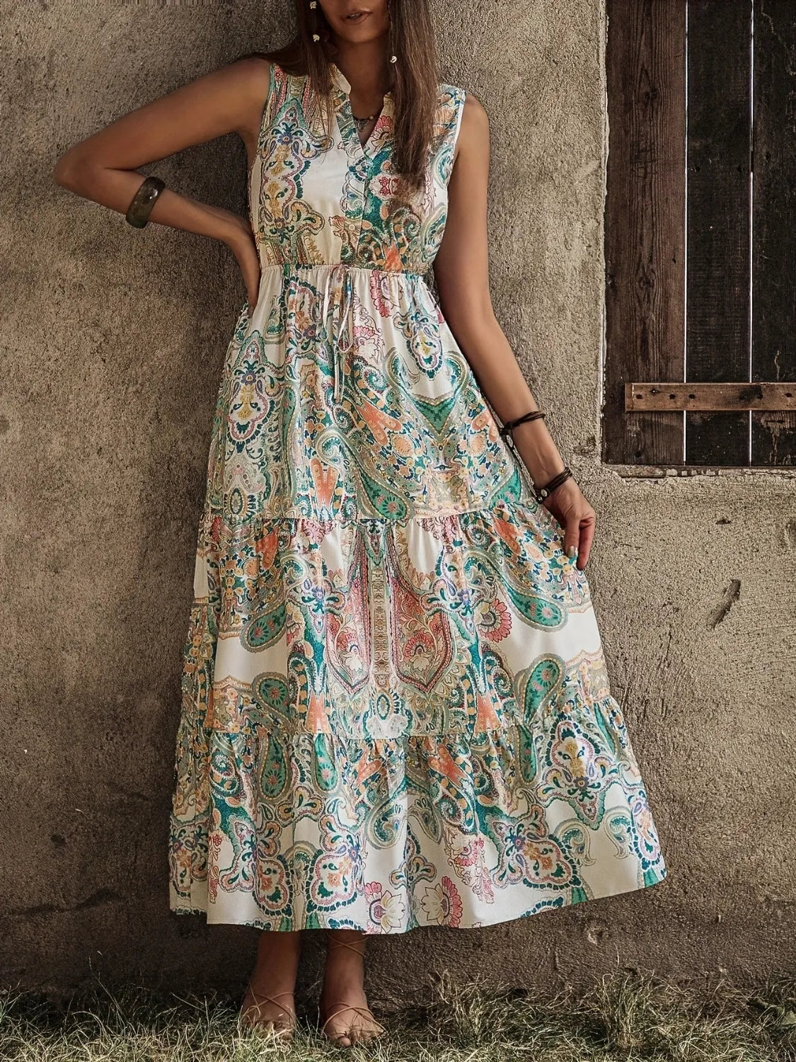 Questo abito lungo senza maniche con stampa paisley in tonalità verde e pesca è un’esplosione di stile boho e comfort.