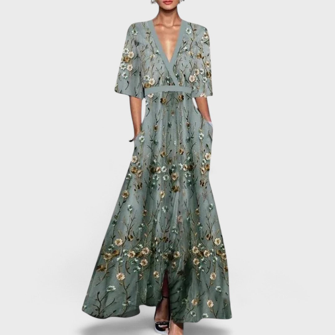 Questo abito lungo con ricami floreali è la scelta perfetta per momenti speciali sotto il sole.