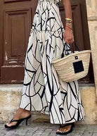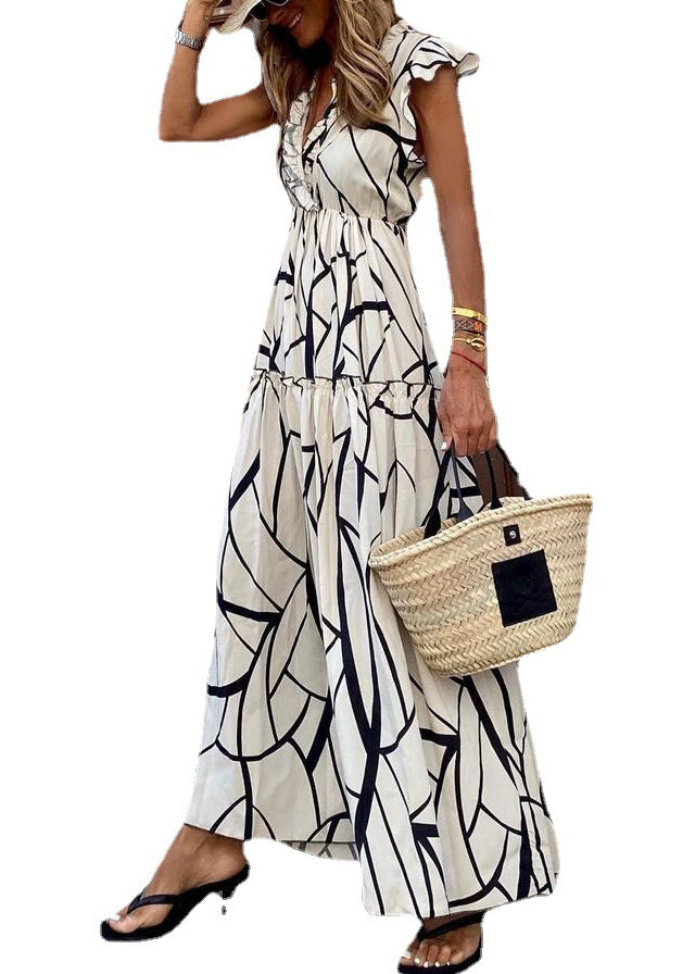Questo abito lungo con stampa grafica e maniche a volant è l’equilibrio perfetto tra stile e comodità.