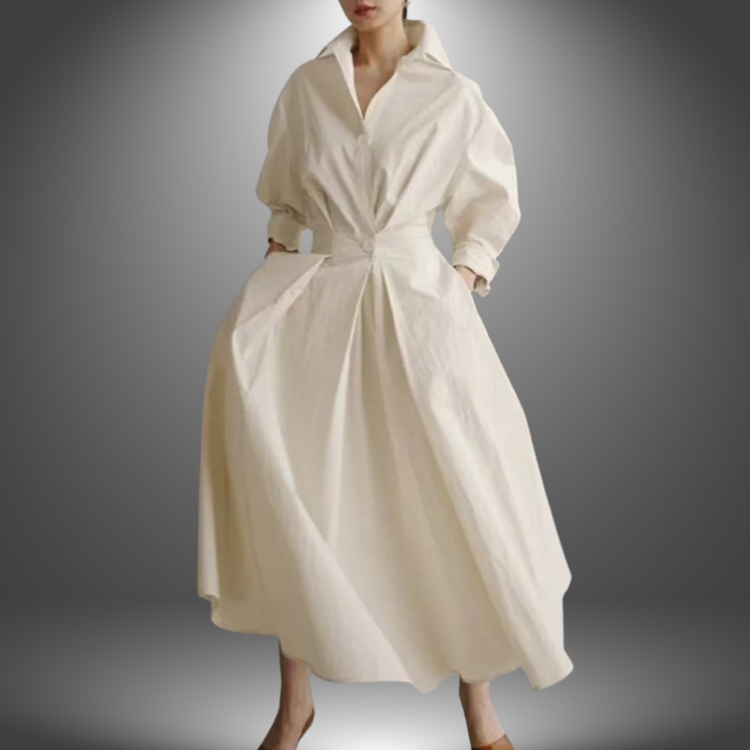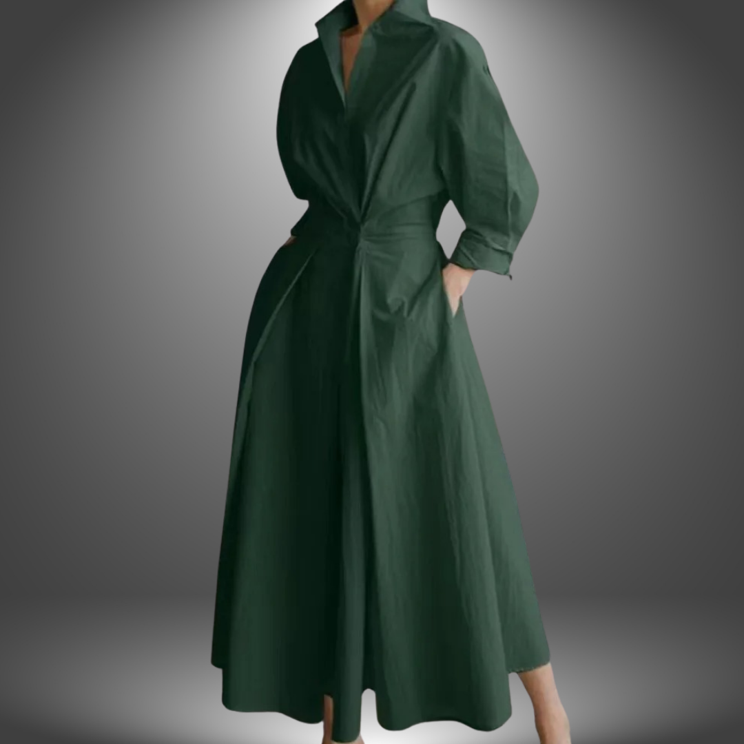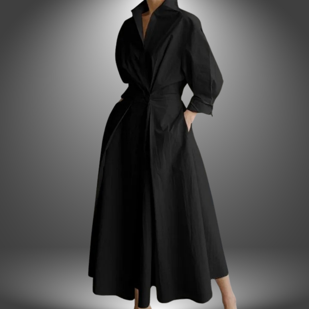 Questo abito lungo con colletto e maniche 3/4 coniuga eleganza, struttura e modernità in un unico capo di tendenza.