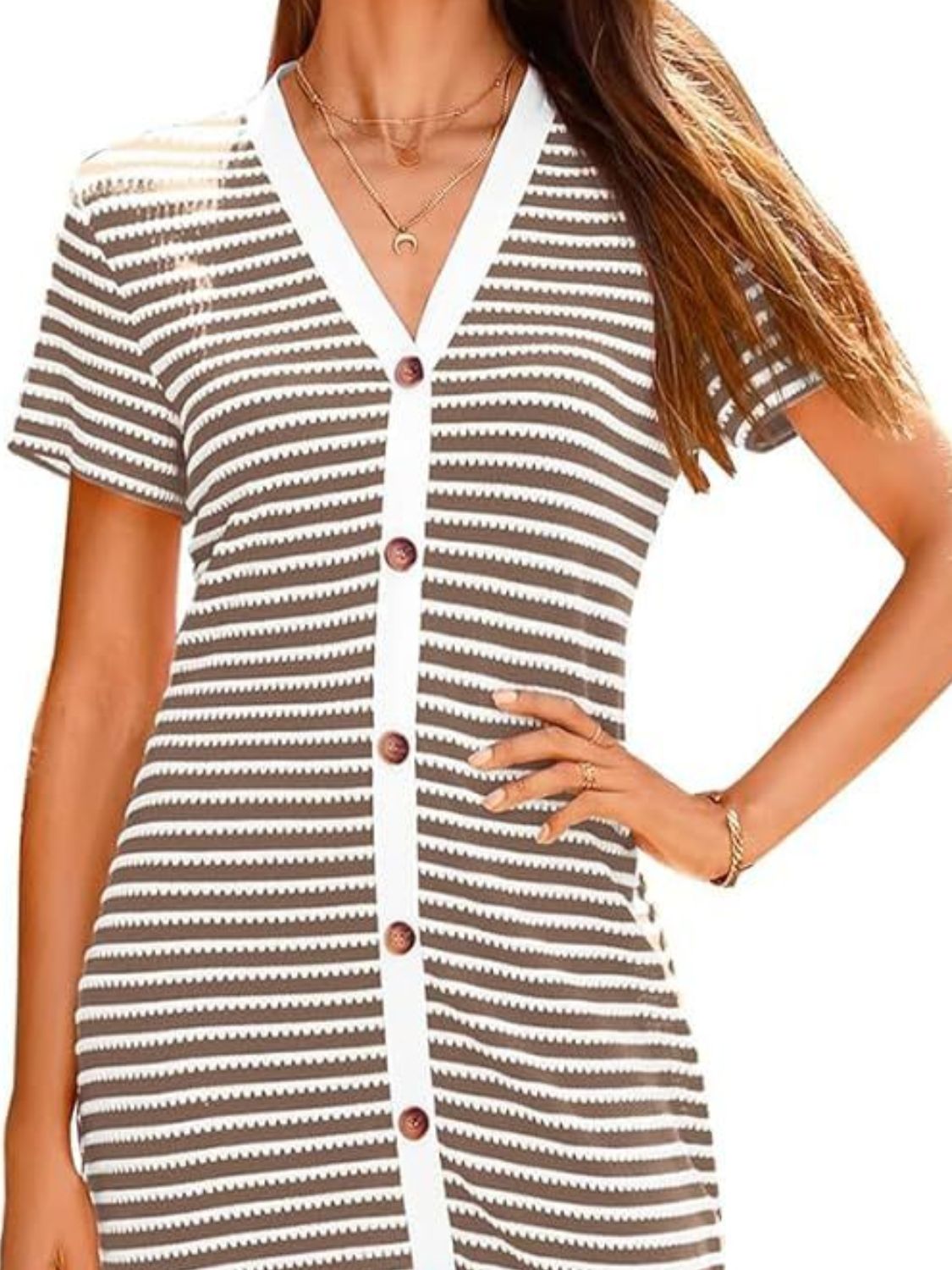 Questo elegante vestito a righe con bottoni frontali è l'emblema dello stile casual-chic.