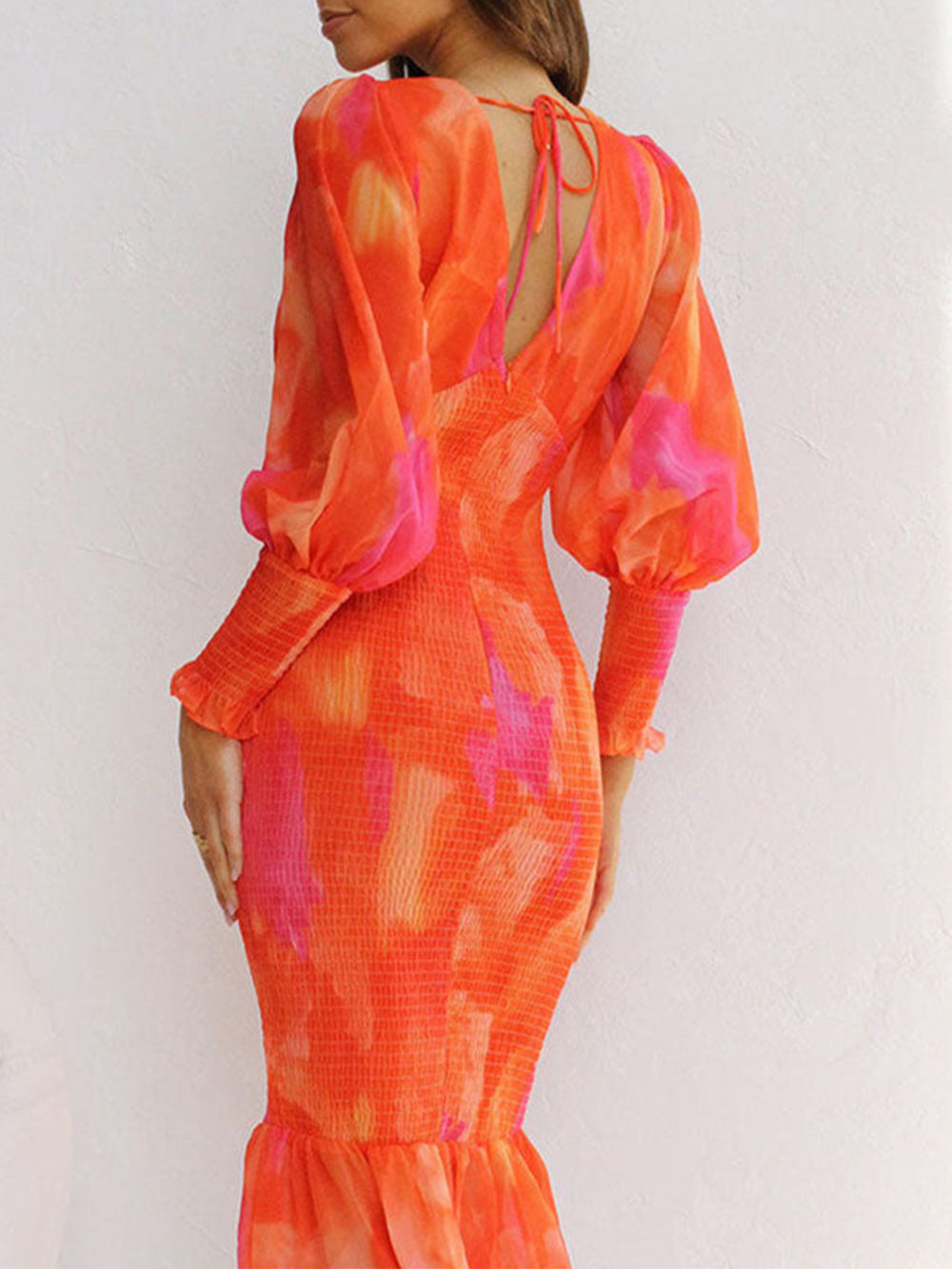 Questo abito midi è un vero concentrato di femminilità e vitalità. La sua stampa astratta in arancio e fucsia crea un effetto visivo magnetico, mentre il taglio con maniche a palloncino, scollo a V e orlo a balza dona movimento e leggerezza. Il tessuto è leggero e fluttuante, perfetto per accompagnarti nelle giornate calde e luminose. Elegante ma easy da indossare, è l’alleato ideale per brunch estivi, eventi informali o un aperitivo in terrazza.