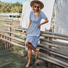 Questo abito midi bohémien presenta un elegante scollo a V, maniche corte a sbuffo e una vita arricciata che valorizza la silhouette. Il tessuto leggero e fluido lo rende ideale per passeggiate, brunch e vacanze.