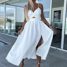 Questo abito midi con dettagli cut-out è la scelta ideale per un look audace e sofisticato. Il design con scollo a V profondo, spalline sottili e spacco laterale aggiunge un tocco sensuale, mentre la gonna fluida dona movimento ed eleganza.