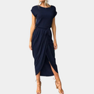 Questo abito midi con nodo laterale e spacco frontale combina eleganza e comfort, grazie al tessuto morbido e alla vestibilità fluida.