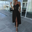 - Design: Scollo a cuore, spalline sottili regolabili, cut-out sotto il busto e spacco laterale