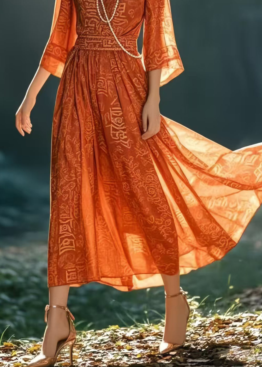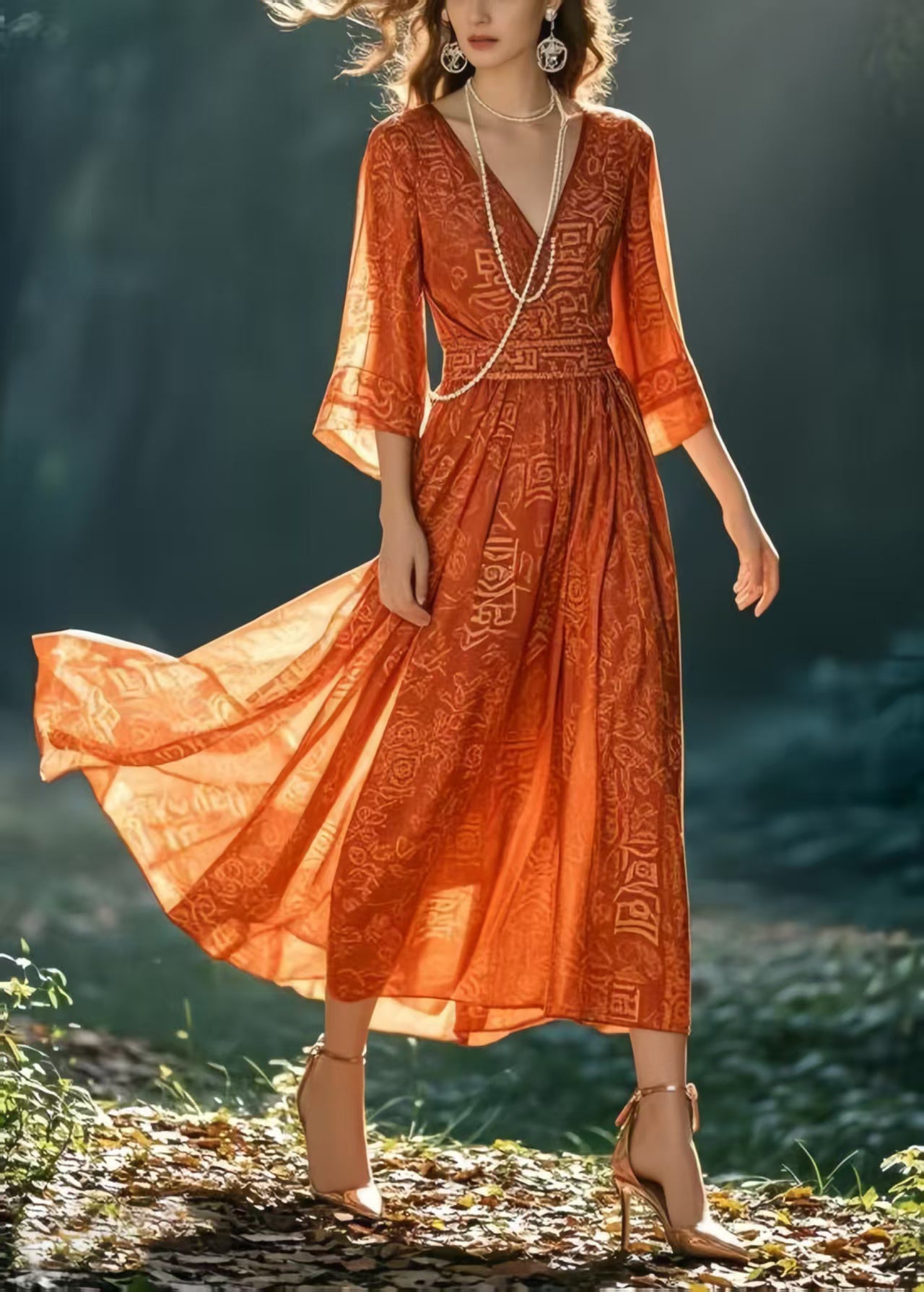 Questo abito midi in tonalità terracotta conquista con il suo motivo etnico e la silhouette femminile.
