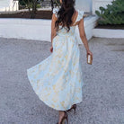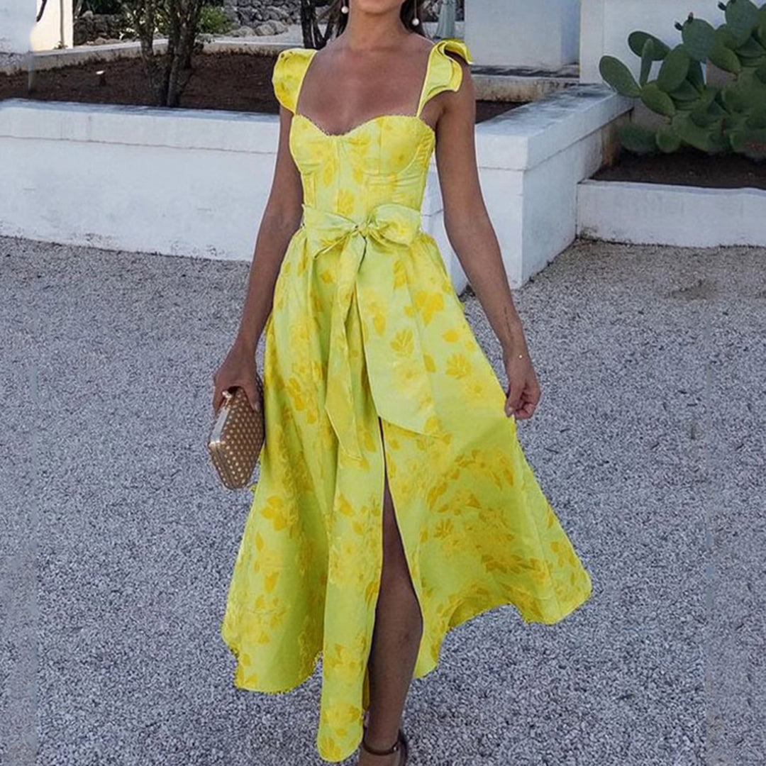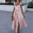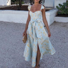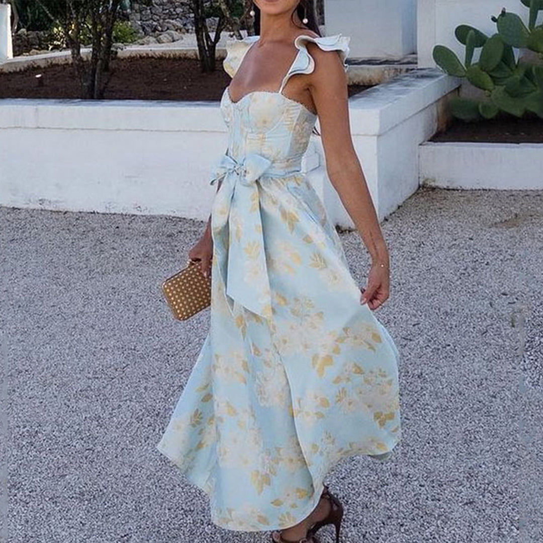 Questo abito midi floreale presenta un delicato scollo a cuore, spalline sottili regolabili e un fiocco in vita che valorizza la silhouette. Perfetto per matrimoni, vacanze o passeggiate eleganti.