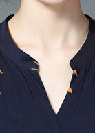 • Stampa Floreale: Motivo a fiori rossi e arancio su fondo blu scuro