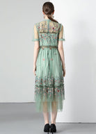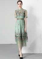 Questo abito midi in tulle verde con ricami floreali dona un’eleganza raffinata e femminile.