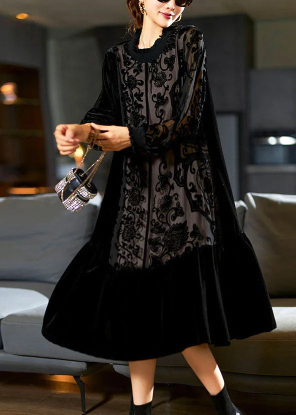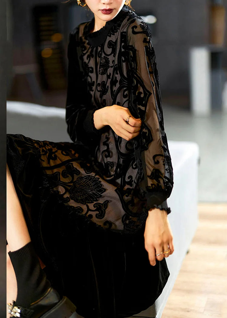 Questo vestito midi in velluto con dettagli floreali in trasparenza è un capo che unisce femminilità e raffinatezza.