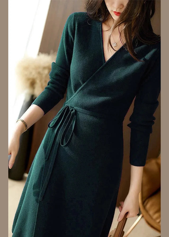 Questo abito midi con scollo a V incrociato e cintura laterale è un classico intramontabile che valorizza la silhouette.