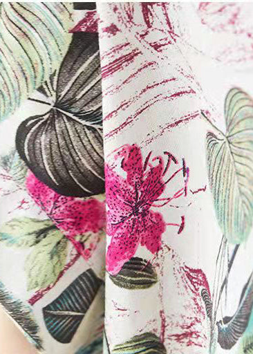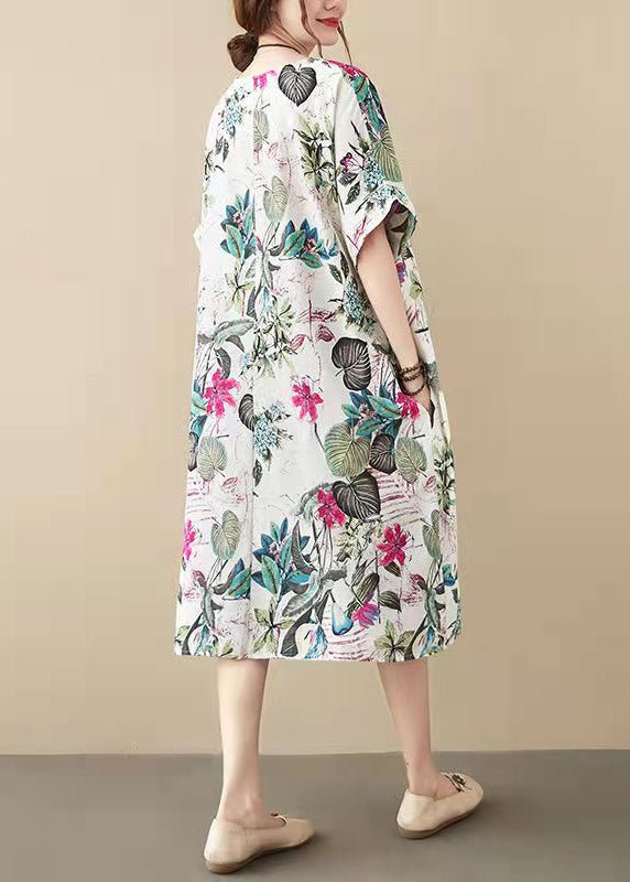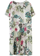 Questo abito midi in cotone con stampa botanica colorata è perfetto per passeggiate all’aria aperta o pomeriggi di relax.