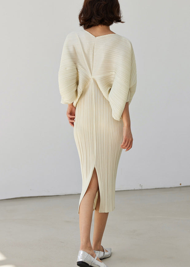 Questo abito midi plissettato combina eleganza e modernità con un taglio morbido e raffinato.