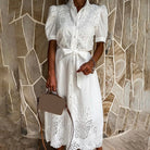 Questo abito midi in stile chemisier è impreziosito da raffinati ricami traforati che donano un tocco romantico e leggero. Le maniche a sbuffo aggiungono volume e femminilità, mentre la cintura in vita esalta la silhouette. Il design strutturato ma fluido lo rende ideale per occasioni speciali, eventi estivi o look da vacanza chic.