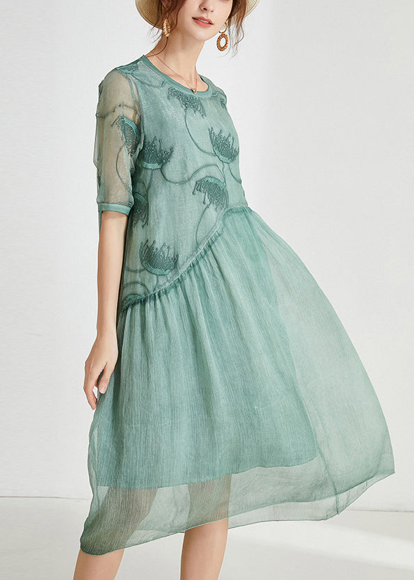 Questo abito midi in tessuto trasparente ricamato unisce grazia e delicatezza con un tocco romantico.