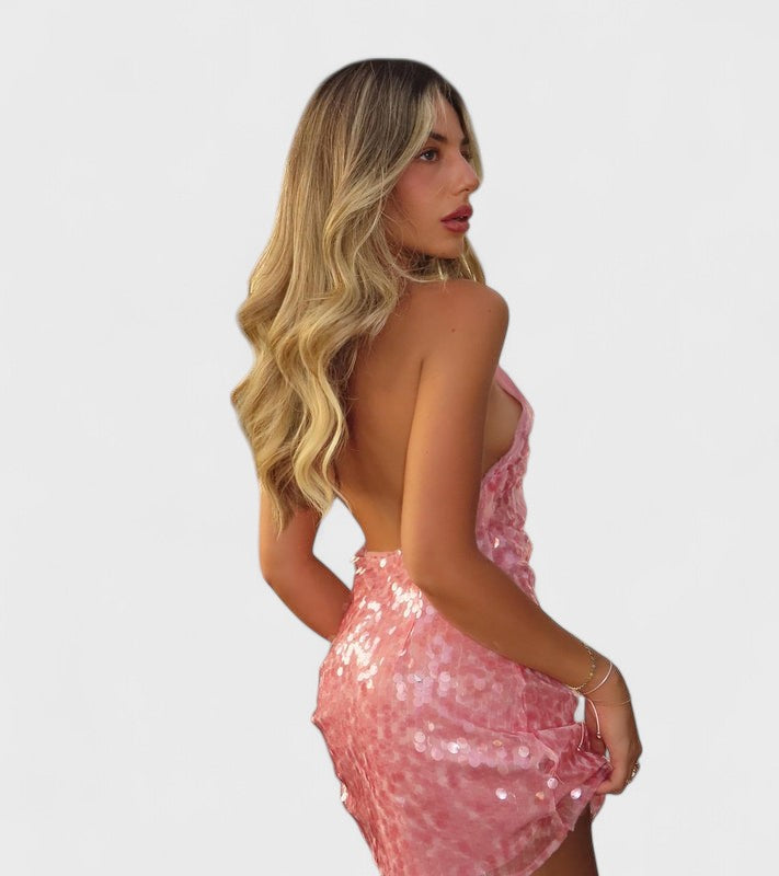 Questo mini dress rosa con paillettes cattura la luce ad ogni movimento, mettendo in risalto la tua silhouette con eleganza.
