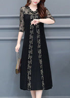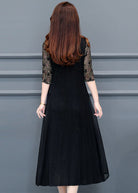 Questo vestito midi nero con dettagli in pizzo ricamato unisce raffinatezza e comfort in uno stile sobrio e senza tempo.