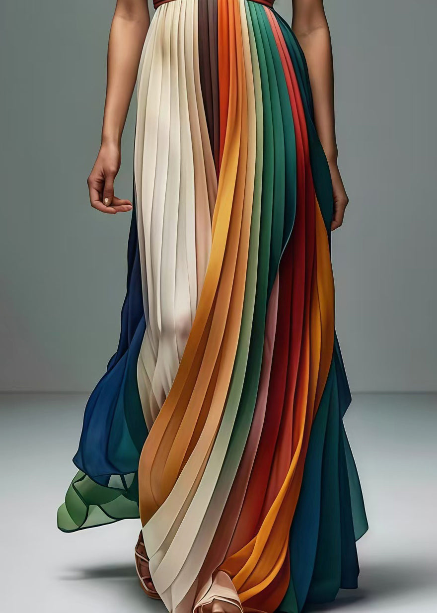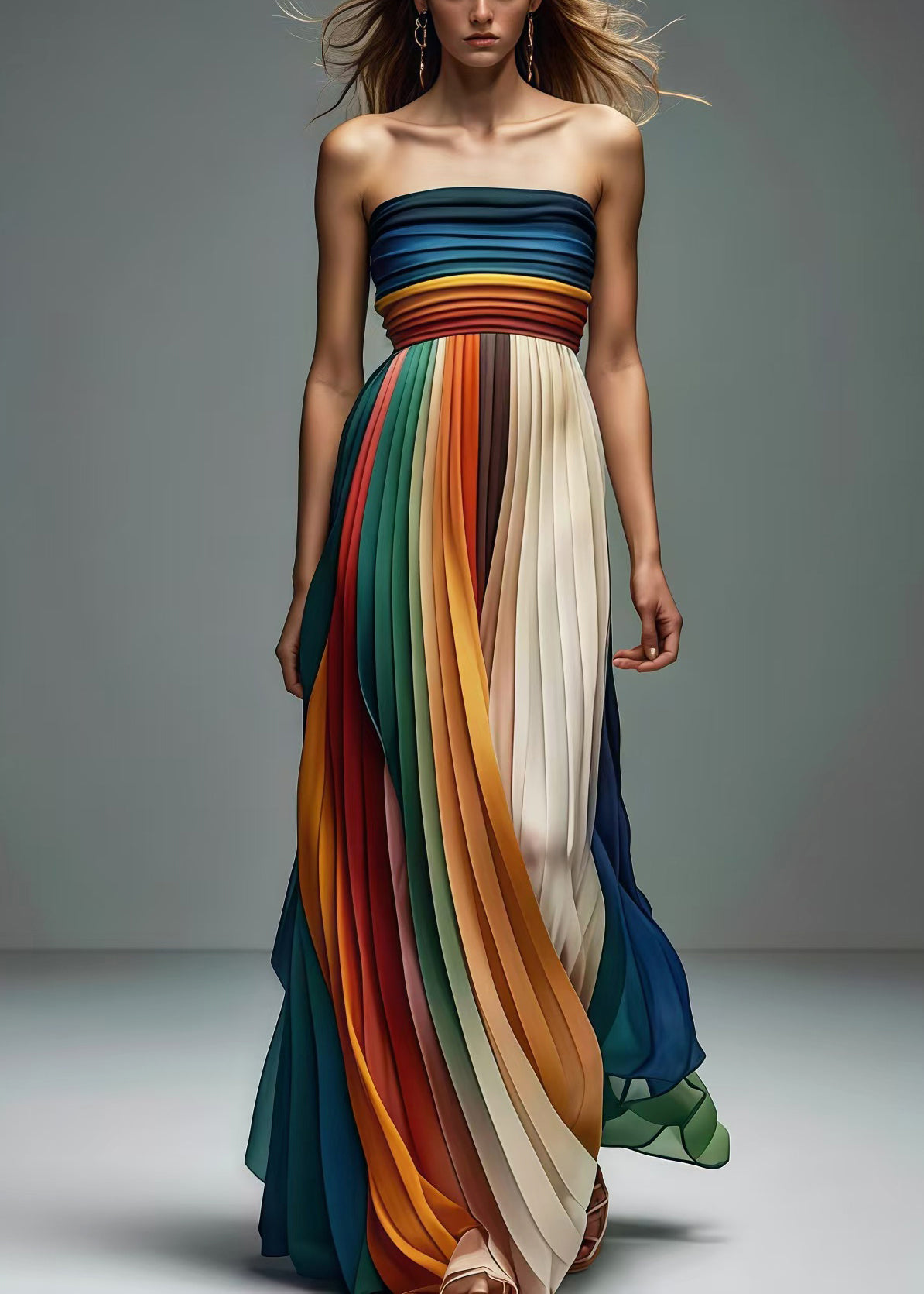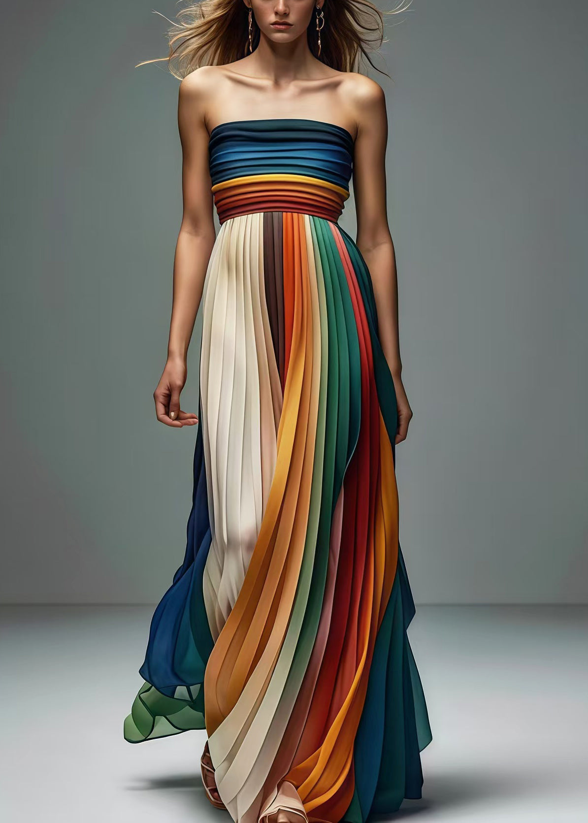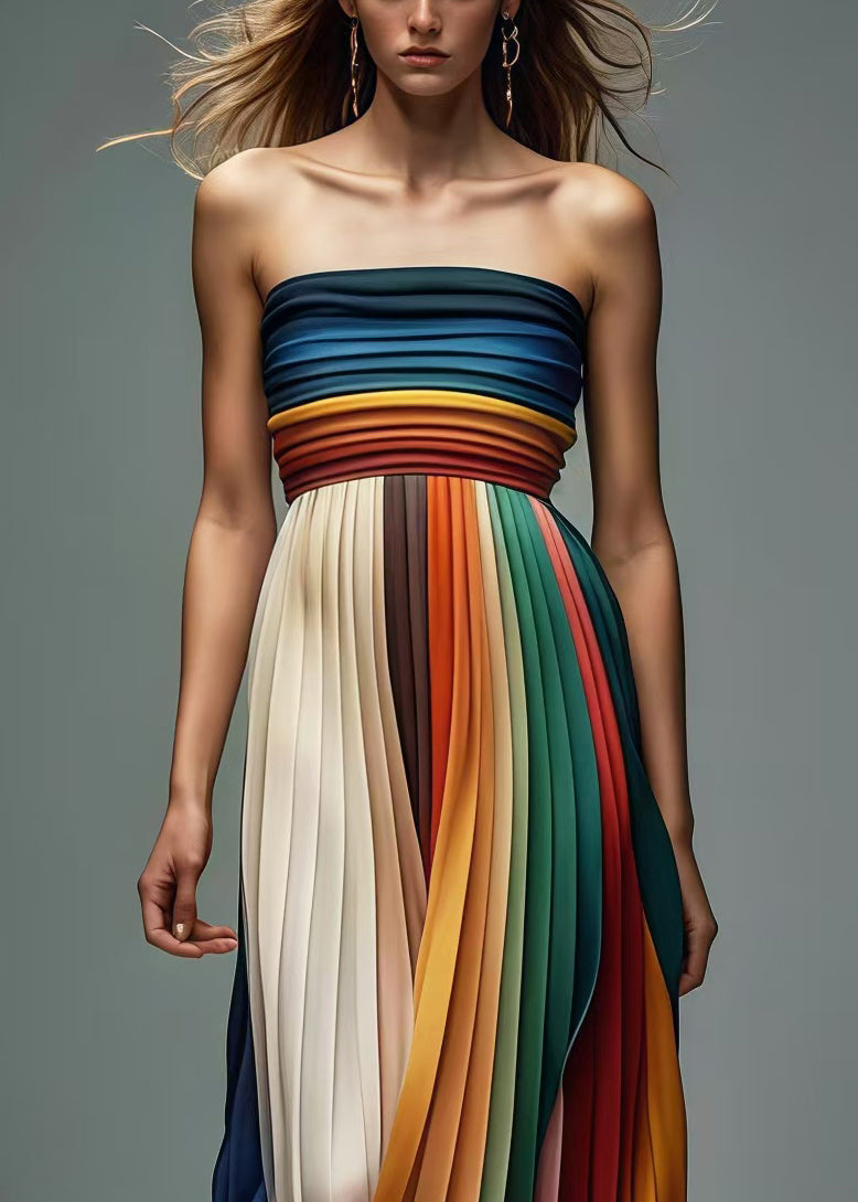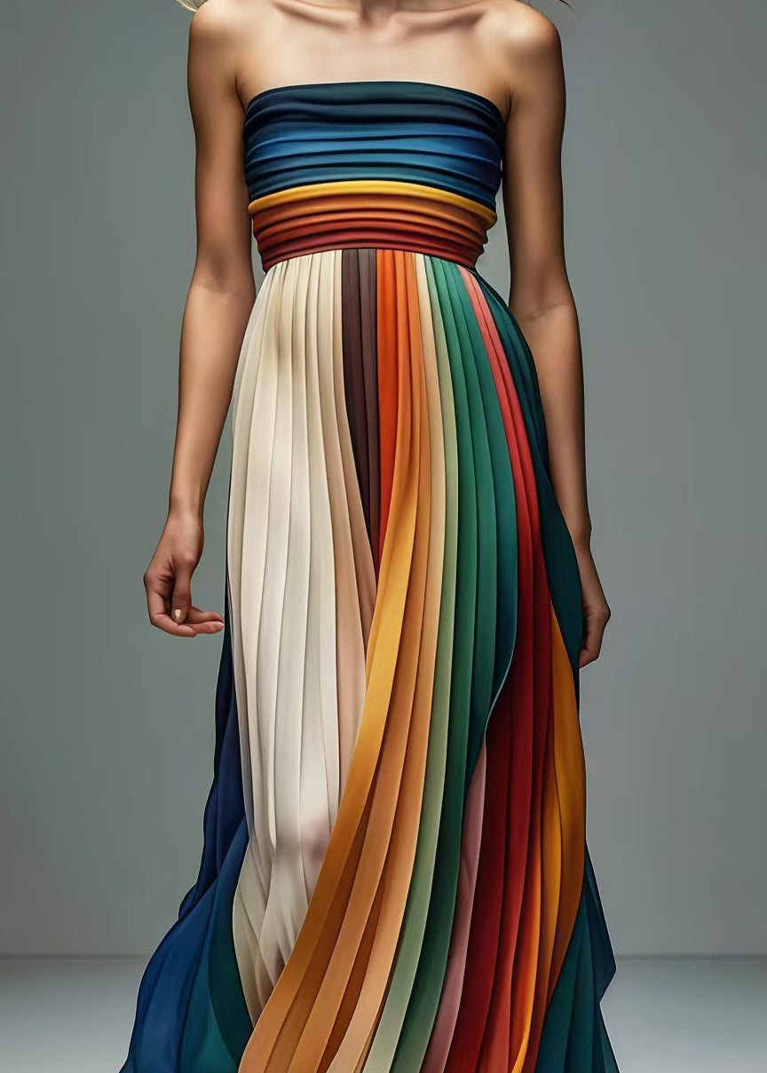 Questo abito lungo a pieghe multicolore cattura l’attenzione con le sue sfumature vivaci e il design senza spalline.