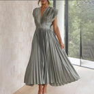 Questo abito plissettato con scollo a V e silhouette fluida è perfetto per eventi, cerimonie e serate eleganti.