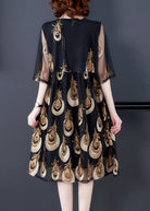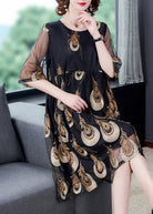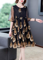 Questo abito nero con ricami dorati effetto piume di pavone è la perfetta combinazione tra eleganza e originalità.