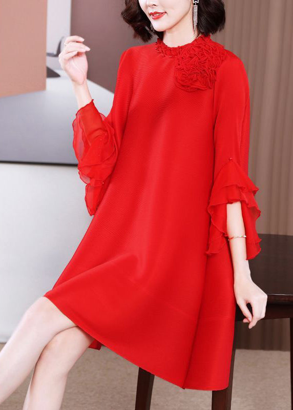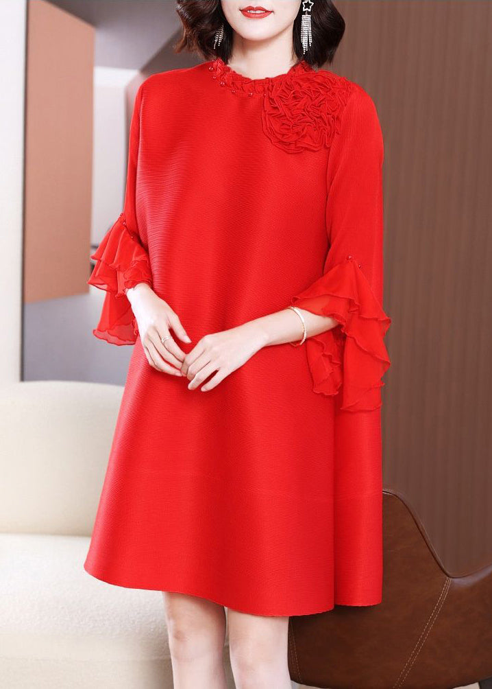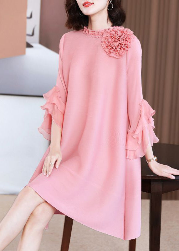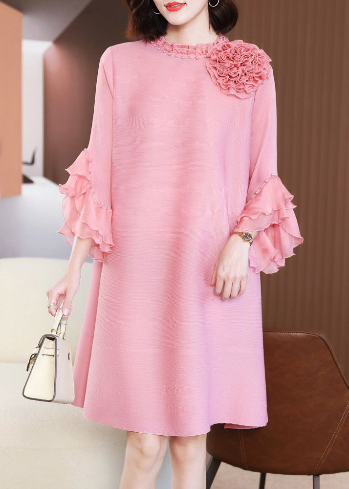 Questo vestito rosa con maniche a balze e applicazione floreale è la scelta perfetta per un look sofisticato e romantico.