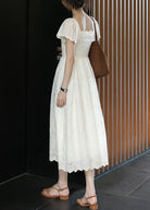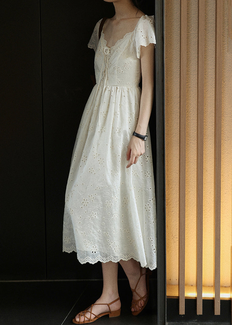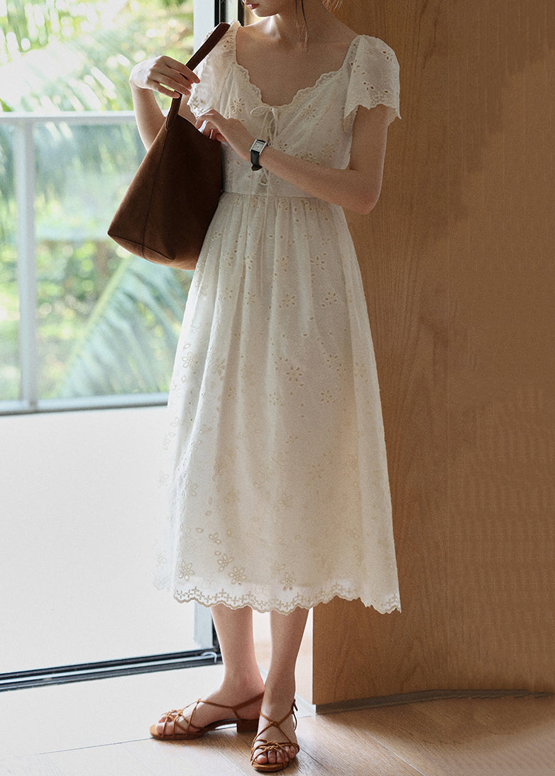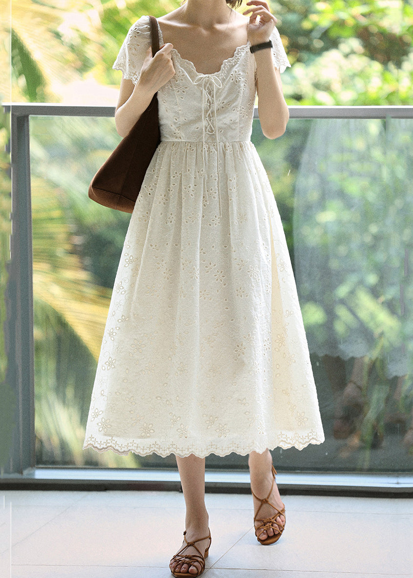 Questo vestito in pizzo sangallo è l’emblema della femminilità estiva, con un design delicato e dettagli ricamati.