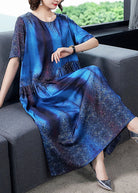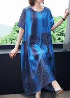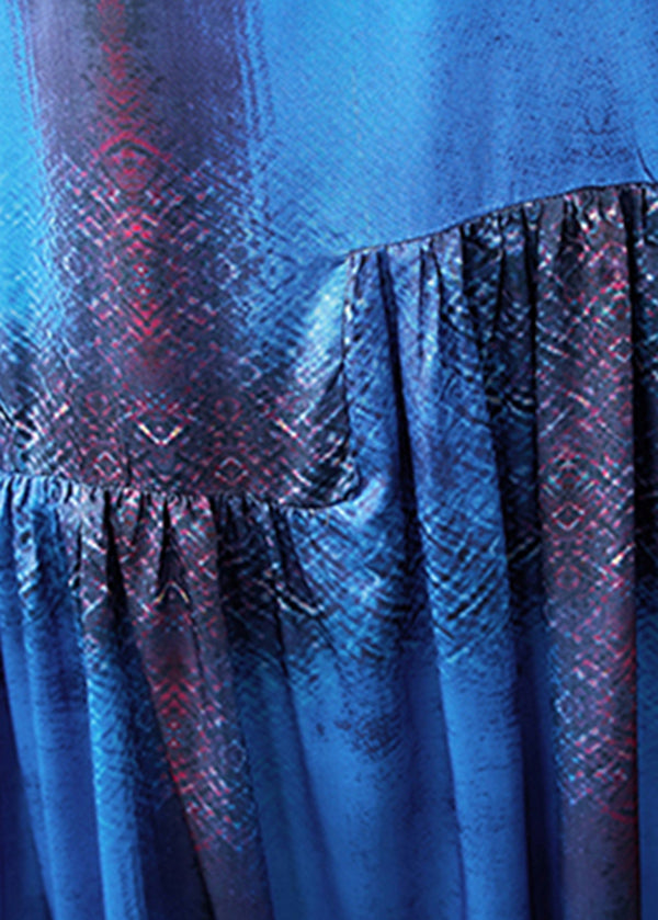 Questo abito midi sfumato nei toni del blu con dettagli grafici è perfetto per un’eleganza rilassata e moderna.