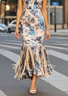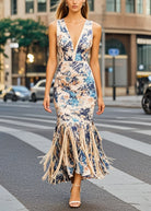 Questo abito a sirena con stampa floreale e frange dinamiche unisce sensualità e originalità.