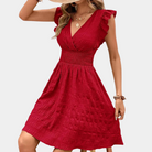 Questo abito skater in pizzo presenta un raffinato scollo a V, eleganti maniche con volant e una vita arricciata che valorizza la silhouette.