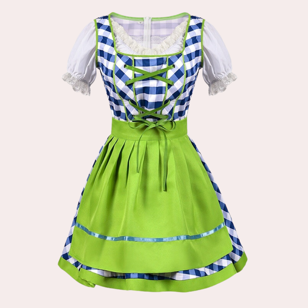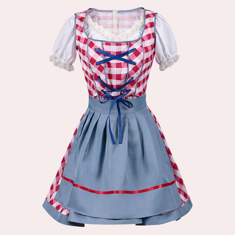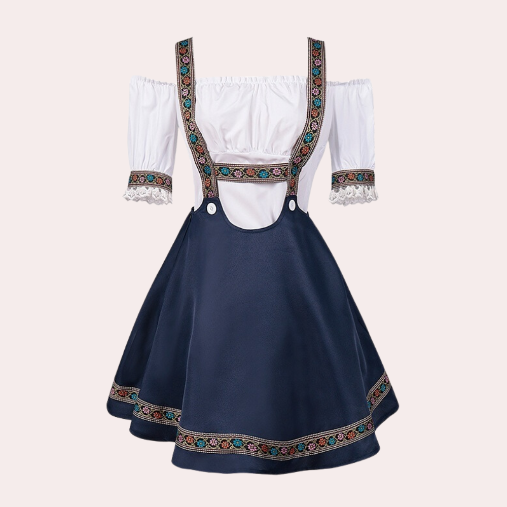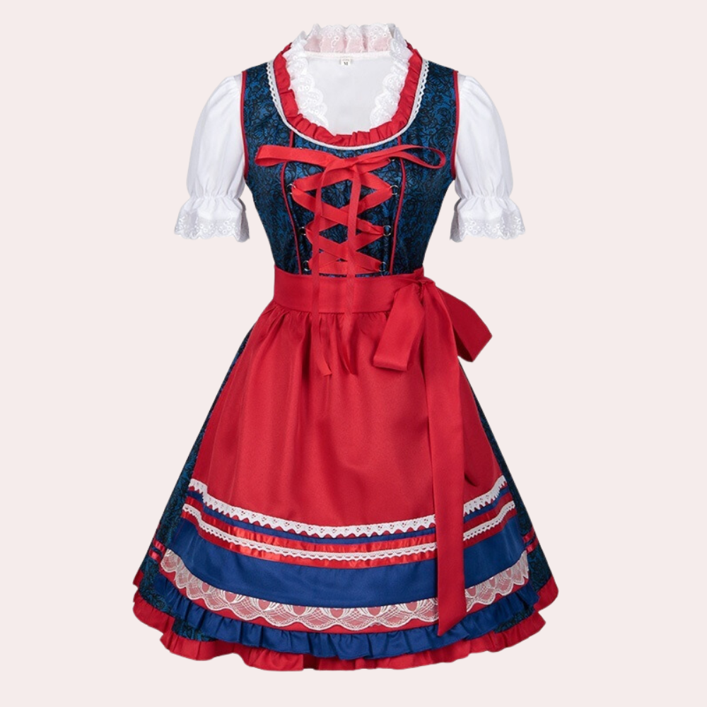 Questo vestito in stile dirndl combina dettagli classici e colori vivaci per un look autentico e affascinante.